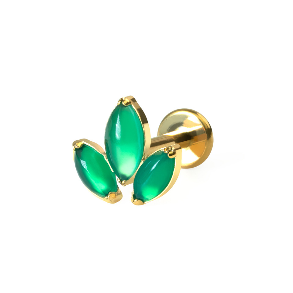 Tätä tyylikästä labrettia koristaa kolme vihreää markiisihiottua kiveä lootusasetelmassa.