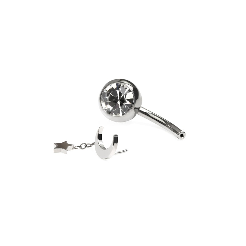 Tämä titaaninapakoru erottuu yläpallon kuunsirppi- ja tähtiriipuskoristeilla, jotka luovat "kelluvan" vaikutelman lävistyksessä. Alempi pallo tuo lisäkimallusta tynnyriupotetulla zirkoniakivellä.