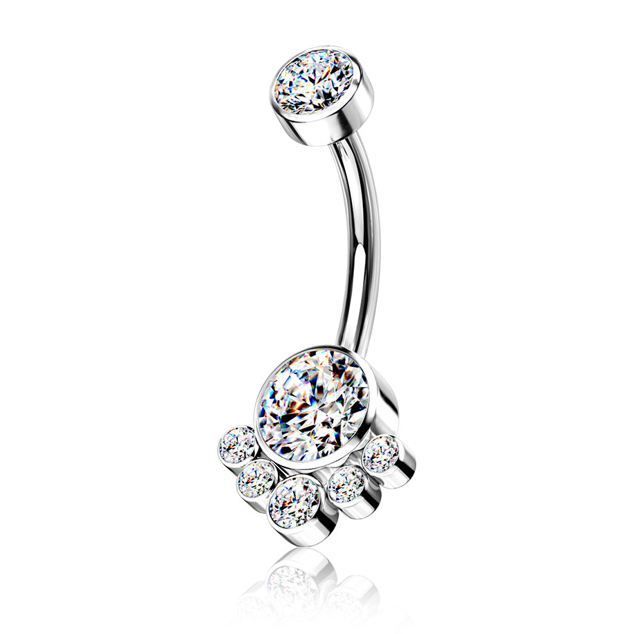 Tässä korussa on kaikki parhaat lävistyskorun ominaisuudet: laadukkain materiaali, eli titaani, mukavuuden ja turvallisuuden takaava sisäkierteinen lukitus sekä lukuisat valoa täydellisesti heijastavat korukivet.