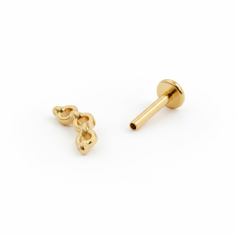 Saatavilla kulta- tai hopeapäällysteisenä, ketjulenkkeihin perustuva muotoilu tuo särmää menemättä överiksi. Valmistettu ASTM F136 -titaanista, se on hypoallergeeninen, vedenkestävä ja voi kestää jopa eliniän oikein hoidettuna. Sisäkierteisyys tekee siitä ärsytysvapaan asetettavan ja se pysyy varmasti kiinni lukitsemisen jälkeen.