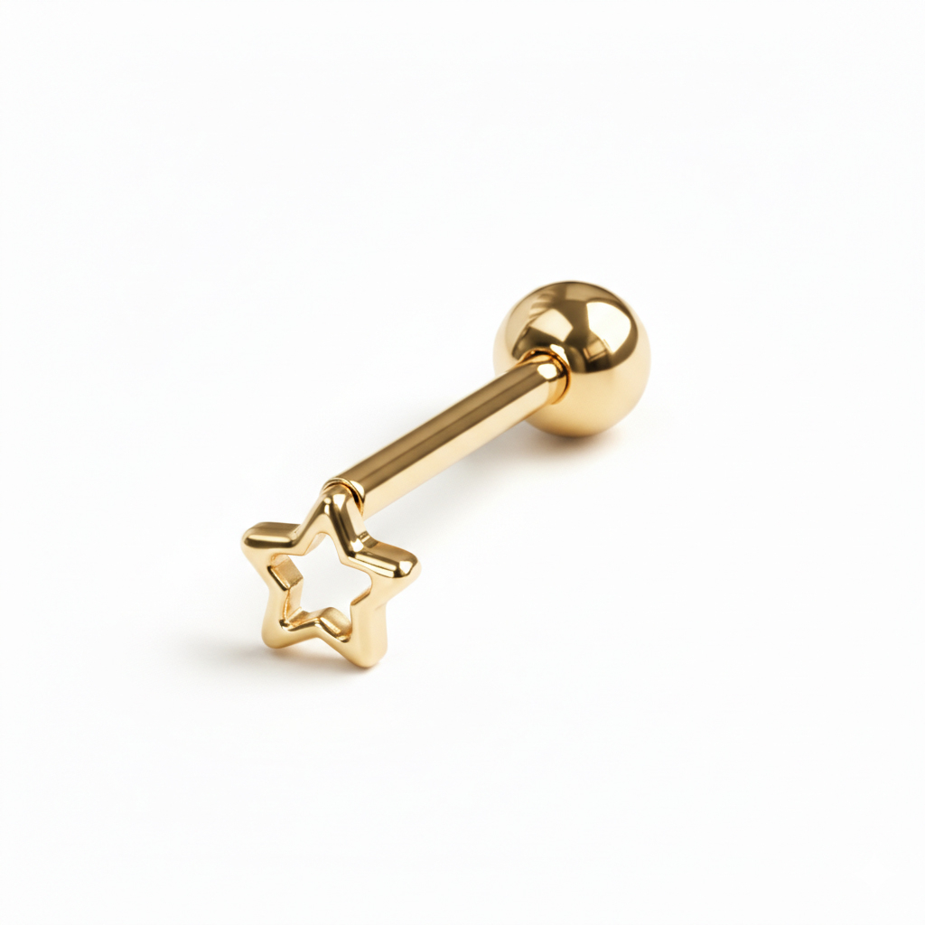 Tämä titaaninen kielibarbelli tähdellä on hypoallergeeninen eli se sopii herkällekin ihotyypille. Koru on sisäkierteinen eli sinun täytyy vain työntää sen sileä juuriosa lävistyksestä ja sitten ruuvata koru paikoilleen.