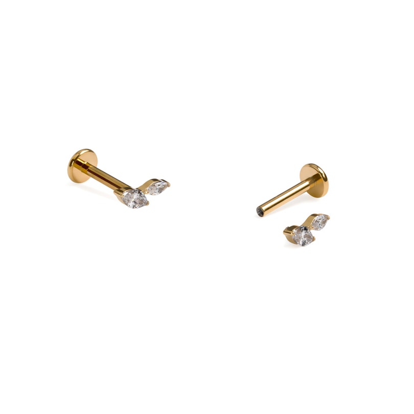 Titaaninen labret kahdella markiisihiotulla korukivellä todistaa, että vähemmän voi olla enemmän. Kaksi pitkänomaista korukiveä asettuu vierekkäin kuin sirot lehdet tai siivet, nostaen korvakorupinoasi juuri sopivasti varastamatta koko show'ta.