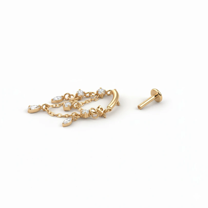 Titaaninen labret kattokruunuriipuksella pohjautuu liikkeeseen. Pienet korukivi-istutukset roikkuvat labretin alla ja tuovat pehmeää liikettä, jonka huomaat aina kun käännät päätäsi. Se on juhlavahko ilman liioittelua ja toimii hyvin, kun jotain vähän erilaista arkipäivän koruiltasi. Saatavilla kulta- tai hopeapäällysteisenä.