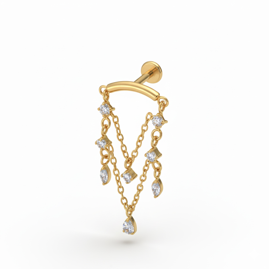 Titaaninen labret kattokruunuriipuksella pohjautuu liikkeeseen. Pienet korukivi-istutukset roikkuvat labretin alla ja tuovat pehmeää liikettä, jonka huomaat aina kun käännät päätäsi. Se on juhlavahko ilman liioittelua ja toimii hyvin, kun jotain vähän erilaista arkipäivän koruiltasi. Saatavilla kulta- tai hopeapäällysteisenä.
