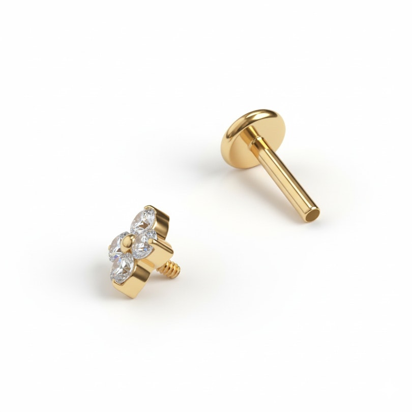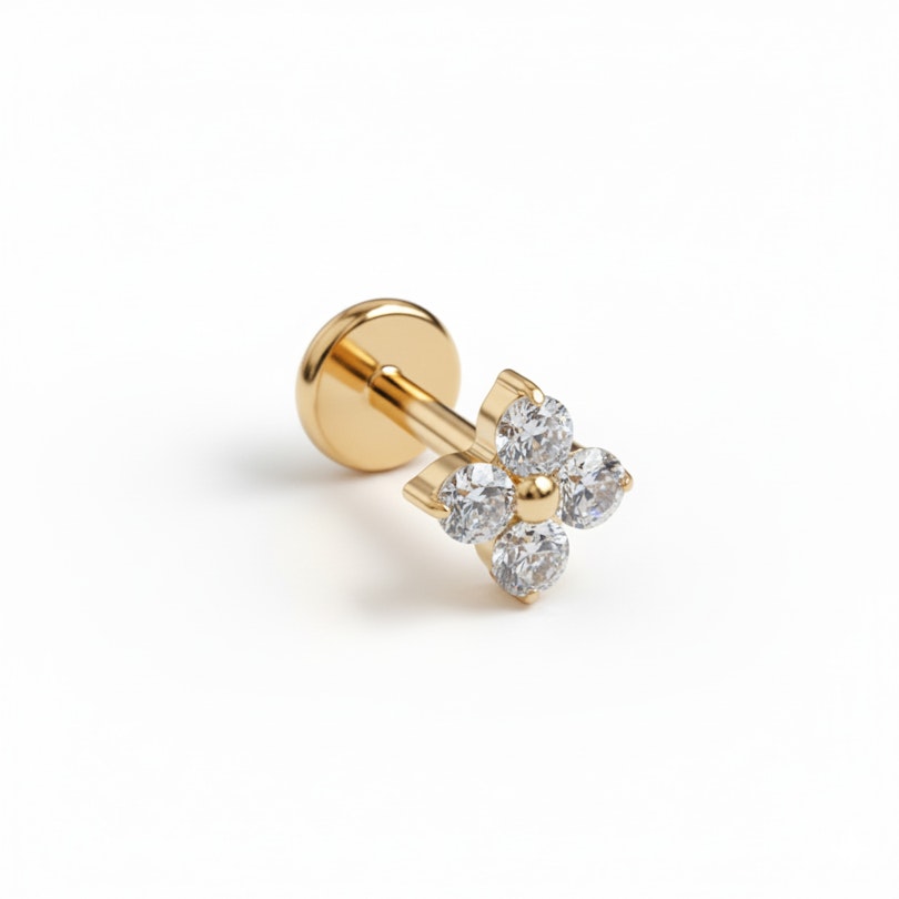 Tämä titaaninen labret miniatyyrikukalla lisää pehmeän, kukkaisan yksityiskohdan, joka on järjestelty kukan muotoon. Kruunuistutettut kivet pysyttelevät lähellä ihoa, joten yksityiskohta ei tunnu lainkaan painavalta.
