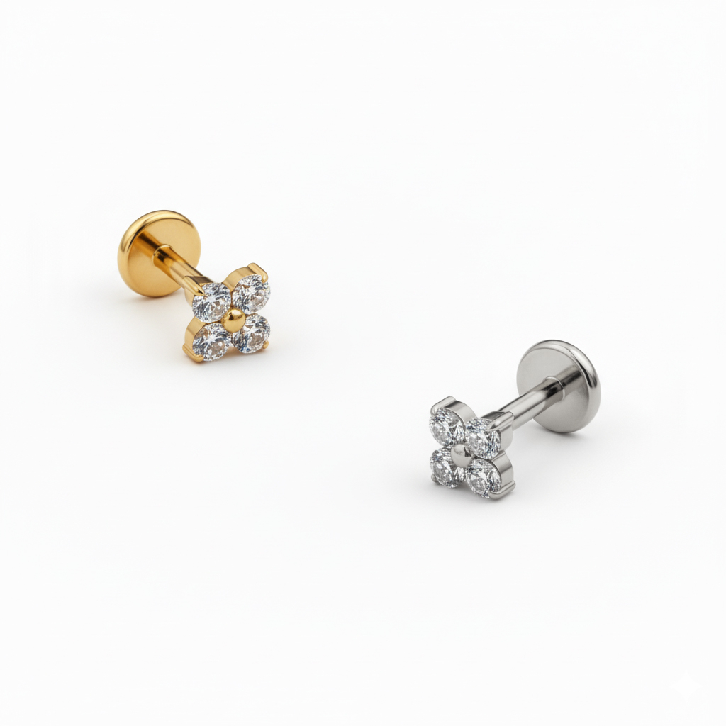 Tämä titaaninen labret miniatyyrikukalla lisää pehmeän, kukkaisan yksityiskohdan, joka on järjestelty kukan muotoon. Kruunuistutettut kivet pysyttelevät lähellä ihoa, joten yksityiskohta ei tunnu lainkaan painavalta.