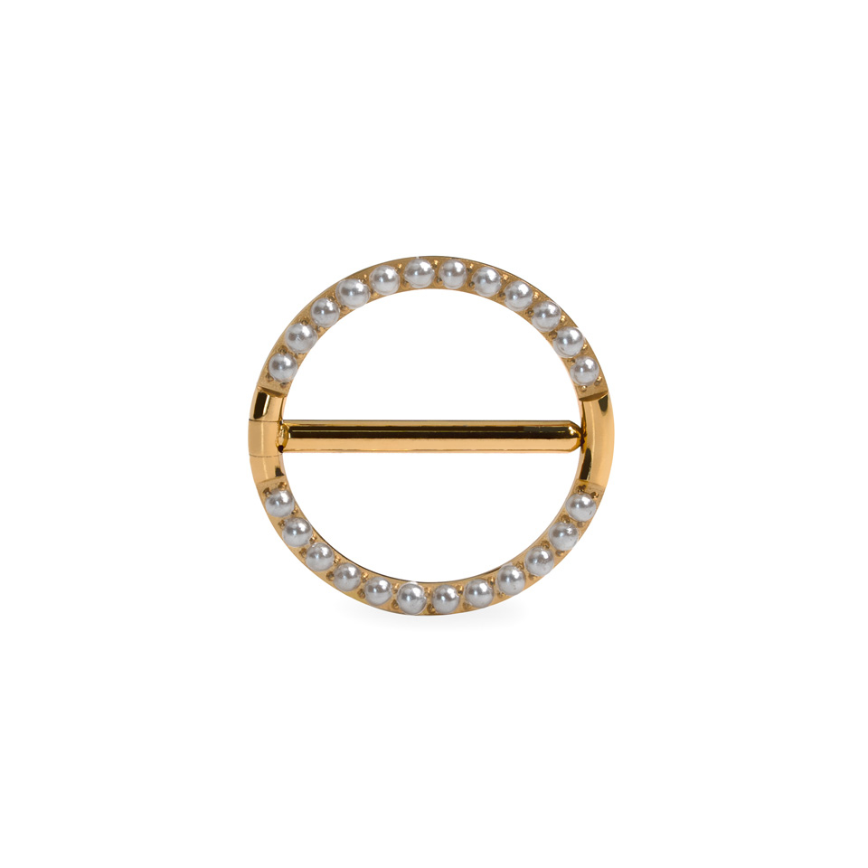 Tämä titaaninen nänni-clicker helmiupotuksin todistaa, että helmet eivät ole vain kaulakoruja varten. Ympyrällinen kruunuistutettuja helmiä kulta- tai hopeapäällysteisenä kehystävät lävistystäsi pilke silmäkulmassa.