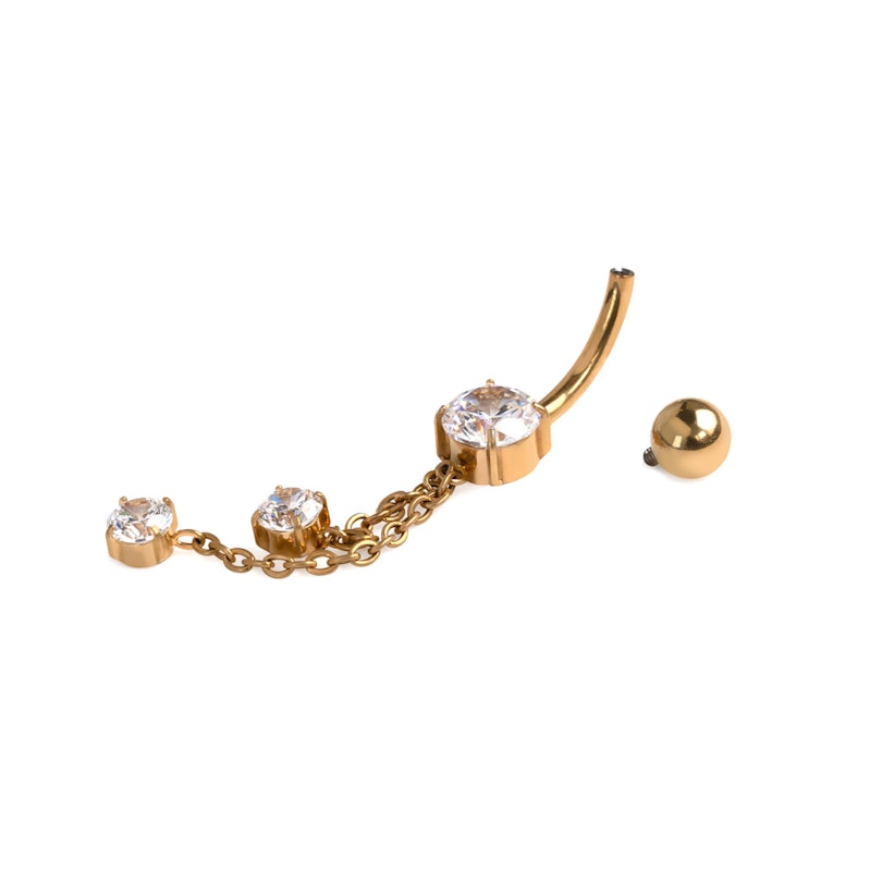 Kaikki napakorut eivät ole tehty kääntämään päitä, mutta tämä titaaninen napakoru ketjuilla ja korukivillä ymmärsi tehtävän. Muodikas titaaninen barbelli, jossa on säihkyvä korukivi ja kaksi siroa ketjua, jotka roikkuvat ja vangitsevat valon jokaisella liikkeellään. Vaivatonta glamouria, koska miksi ei!