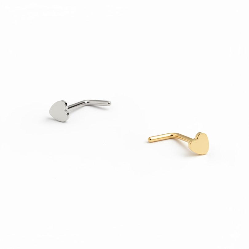 Suunniteltu nenänsivulävistyksiin, tämä sydämenmuotoinen tappi on hienovarainen, mutta ei huomaamaton. Saatavilla kulta- tai hopeapäällysteisenä.