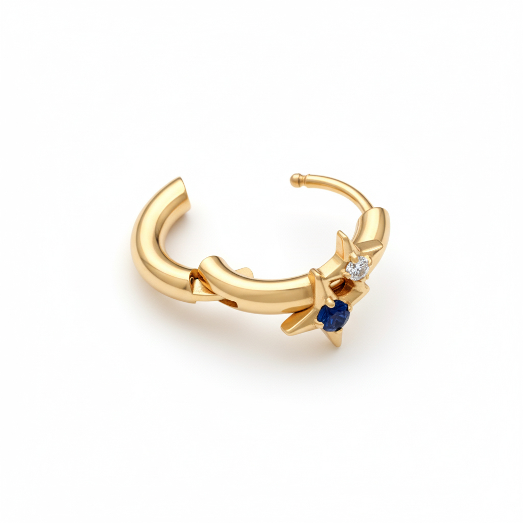 Titaaninen rengas kahdella tähdellä tuo leikkisän vivahteen klassiseen huggy-muotoon. Kaksi pientä tähtidetaljia istuu vierekkäin, joissa molemmissa on värikäs korukivi siistissä kruunuistutuksessa antaen tälle korulle riittävästi luonnetta menemättä överiksi. Saatavilla kulta- ja hopeapäällysteisenä, se on helppo koru yhdistää ilmeikkääseen korupinoon.