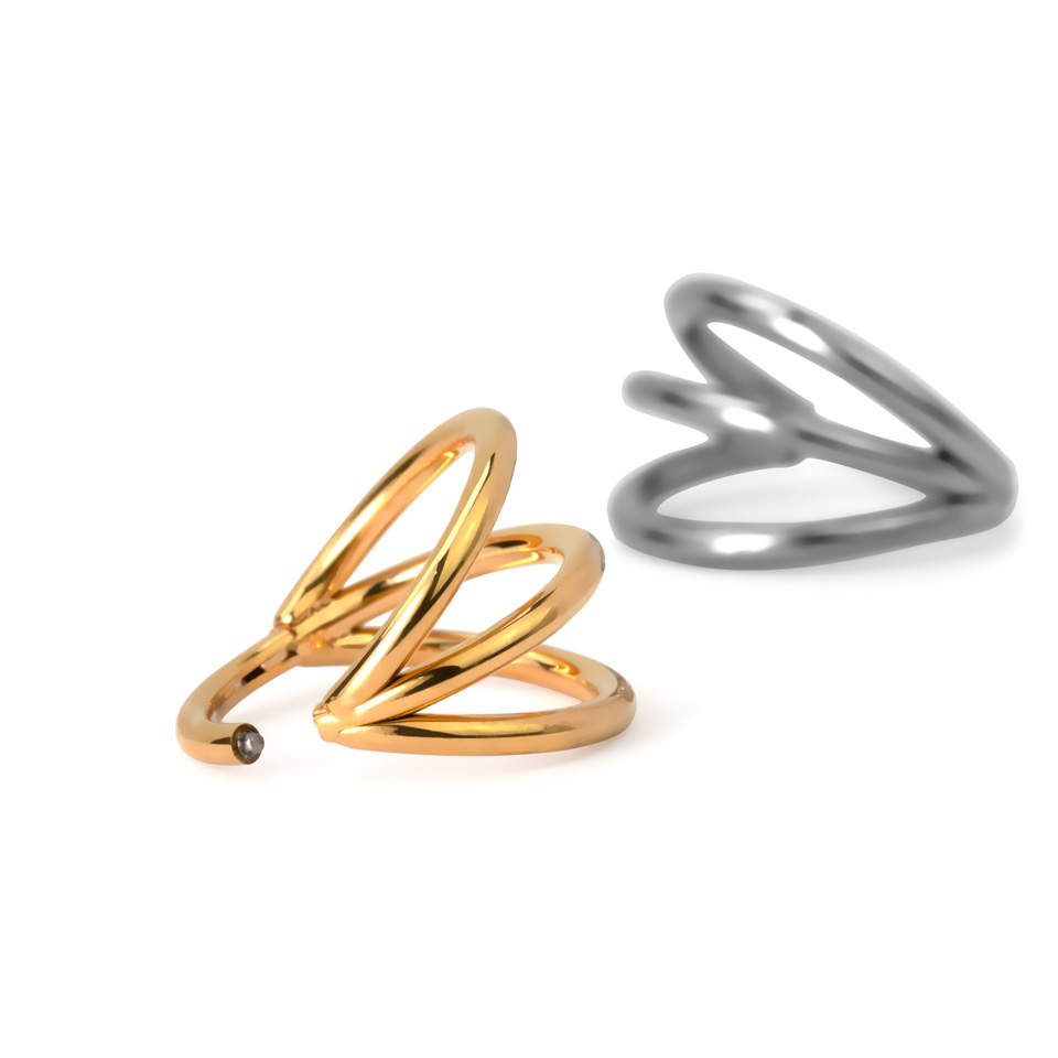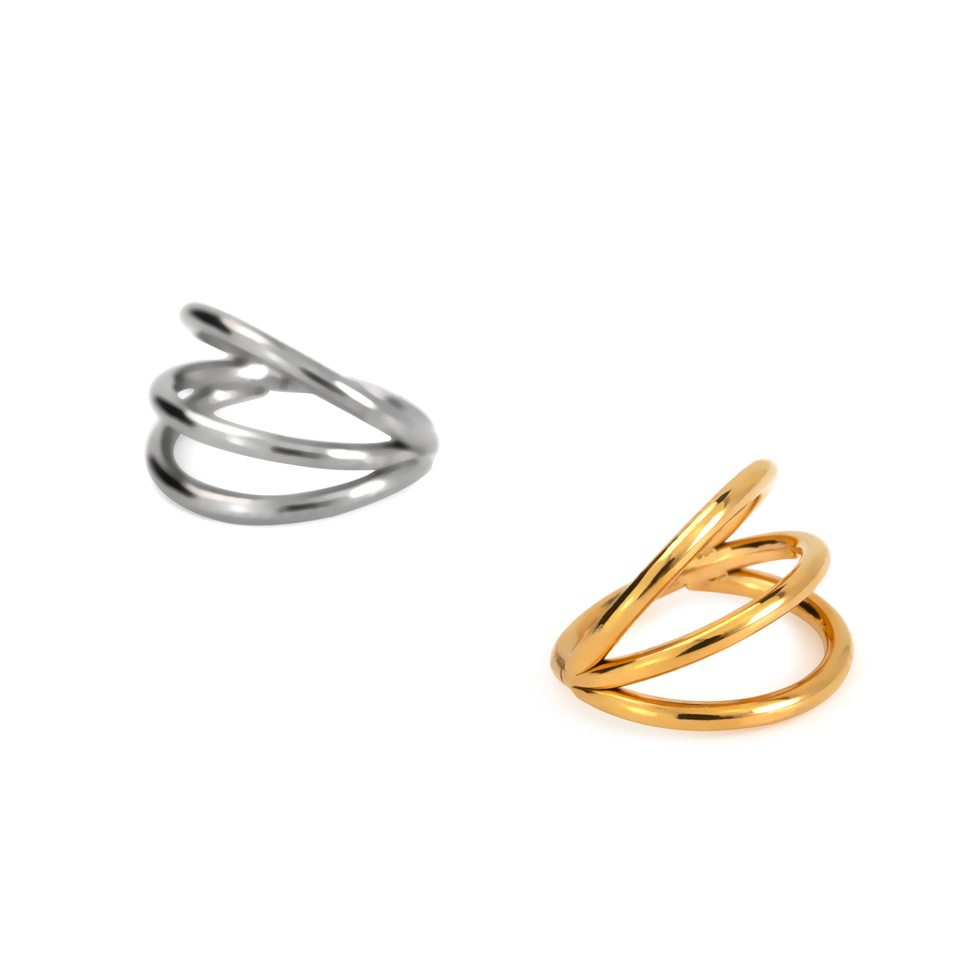 Tässä yksinkertaisessa mutta tehokkaassa renkaassa kolme erillistä kehää yhdistyvät yhdeksi kappaleeksi kulkiessaan lävistyksesi läpi.