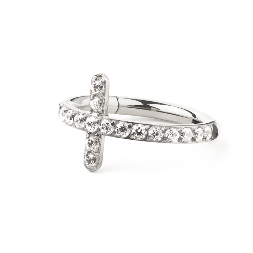 Tämän tyylikkään titaanirenkaan pikkuisilla jalokivillä koristeltu etuosa muodostaa ristikuvion. Saranallinen kiinnitys tekee korusta helpon käytettävän, ja hypoallergeeninen titaani on äärimmäisen kestävä materiaali, joten koru ei tule menettämään hohtoaan. Valittavana on kulta- tai hopeapinnoite sekä 8 tai 10 mm:n halkaisija. Tämä rengas sopii useisiin eri paikkoihin, kuten esimerkiksi korvalehti-, tragus- tai helix-lävistykseen.