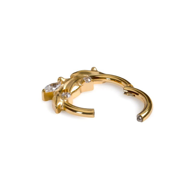 Tämä kaunis titaanirengas siroilla lehdillä on valmistettu titaanista, joten se on sopiva myös herkälle iholle. Sen saranallinen mekanismi tekee siitä helpon ja varman asetettavan lävistyksellesi.