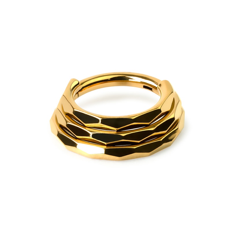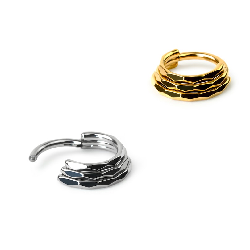 Tämä tyylikäs saranarengas näyttää sisältävän kolme rengasta samassa. Vain keskimmäinen rengas kulkee lävistyksen läpi. Renkaiden ulompi osa on leikattu timanttikuvioiseksi, mikä antaa korulle erikoisen pintarakenteen.