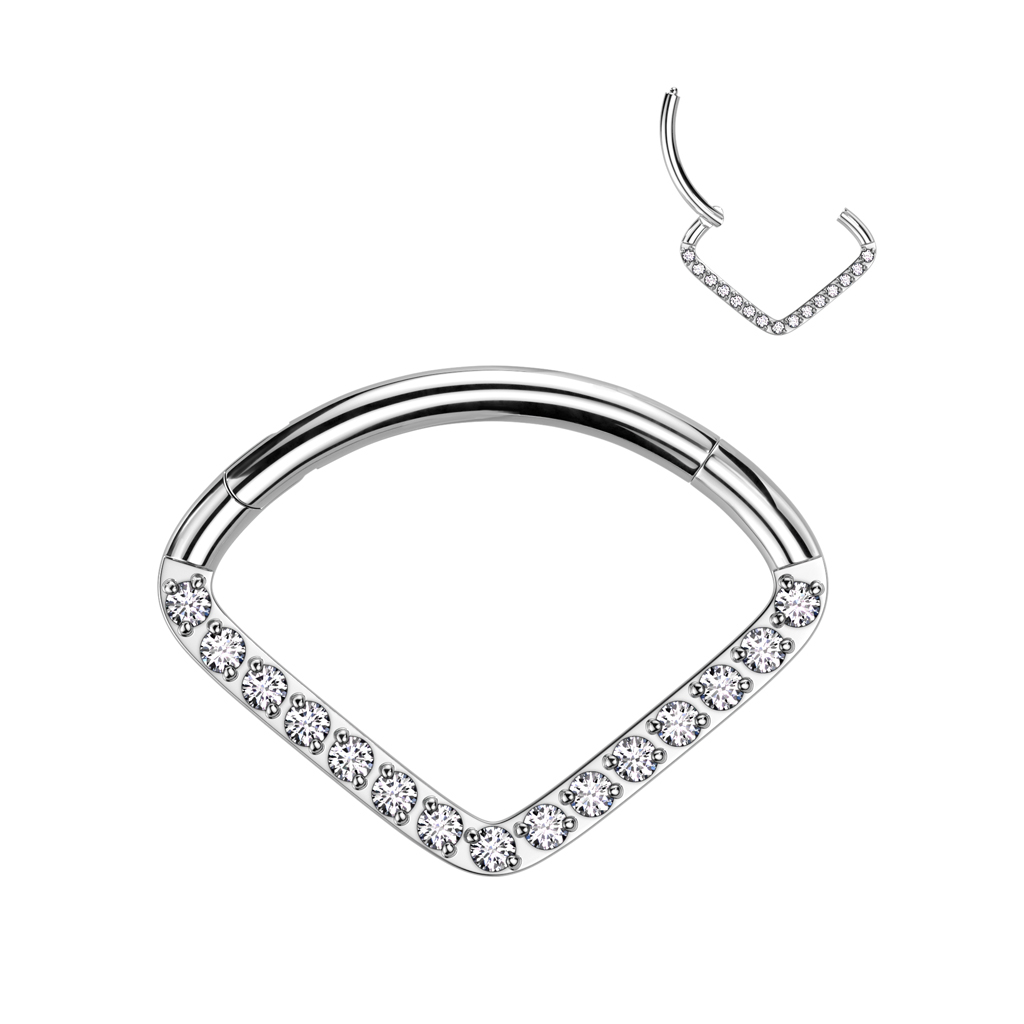 Täältä tulee toivomasi pilke ja kimallus! Tämä ajaton V-muotoinen rengas on koristeltu värittömillä zirkoniakivillä. Lävistykseen asetettava kaareva osa on tasaisen sileä optimaalisen mukavuuden takaamiseksi. Tässä renkaassa on juuri oikea määrä glamouria, ja se herättää taatusti huomiota.