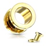 Tämä upea tunneli on valmistettu kirurginteräksestä ja se on saatavilla neljässä eri värissä. Klassinen kirkas malli on valmistettu puhtaasta kirurginteräksestä mutta muut mallit on pinnoitettu eri pinnoitteilla. Esimerkiksi kultainen malli on pinnoitettu 14 karaatin lehtikullalla. Huomioi, että liila väri saattaa sisältää keltaisia sävyjä.
