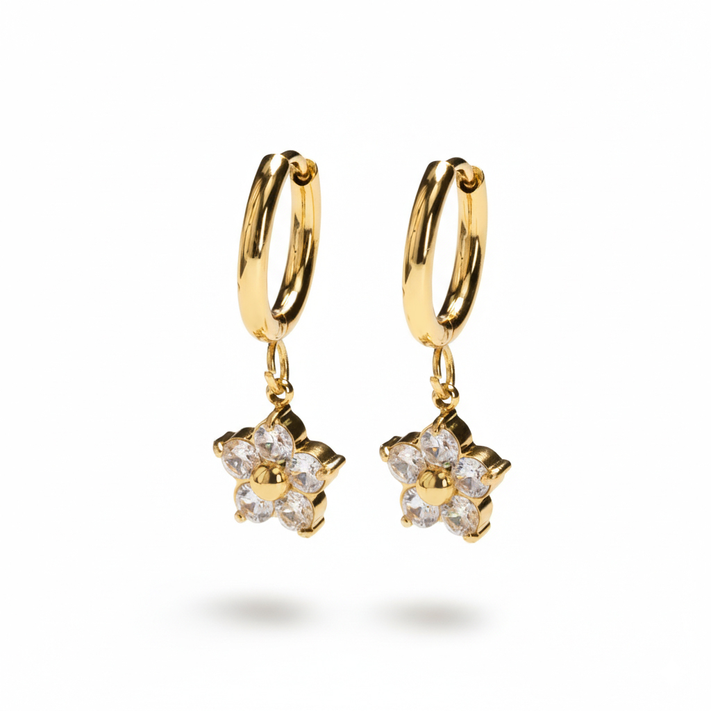 Tämä vannepari kukkariipuksilla on tehty herättämään huomiota. Kummassakin vanteessa on pieni kukkariipus, jossa kivet on asetettu siististi kruunuistutuksella, luoden juuri sopivan määrän katseet pysäyttäviä yksityiskohtia. Nämä ovat sellaiset korvakorut, jotka saa ihmiset uteliaiksi. Saranakiinnityksen avulla koruja on helppo käyttää ja niistä on helppo nauttia.